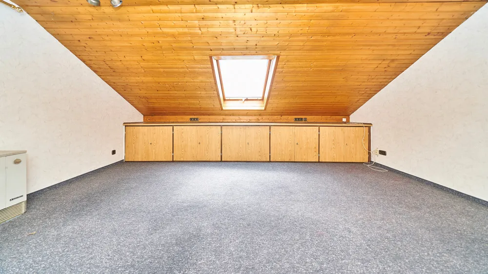 Im Dachgeschoss (ca. 58 m² Wohnfläche, größere Grundfläche durch Dachschrägen) befinden sich zwei Schlafzimmer, ein Wohnzimmer, ein Essbereich, eine Küche und ein Tageslichtbad mit Dusche – ideal als separate Einheit für Jugendliche oder Gäste.