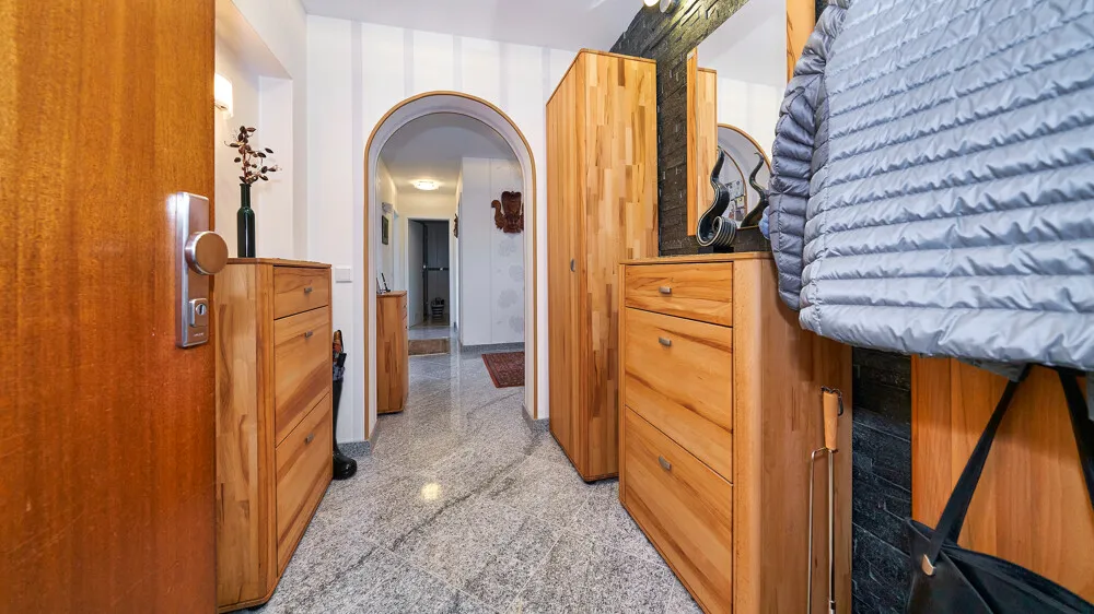 Ein großzügiger Flur verbindet alle Räume. Neben dem Schlafzimmer stehen ein Gäste- bzw. Kinderzimmer sowie ein Homeoffice-Bereich zur Verfügung. Das Badezimmer ist mit einer bodentiefen Dusche ausgestattet, ein separates WC ergänzt das Raumangebot.