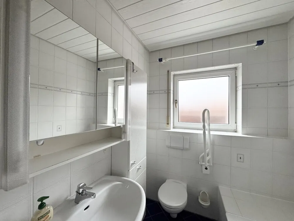 - Tageslicht-Badezimmer mit Dusche, Badewanne, Waschbecken, WC (Fliesen)