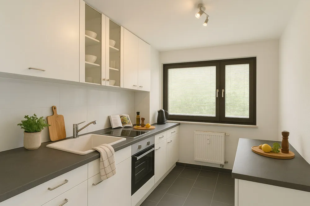 Küche mit einfachen Einbaumöbeln, Elektrogeräten