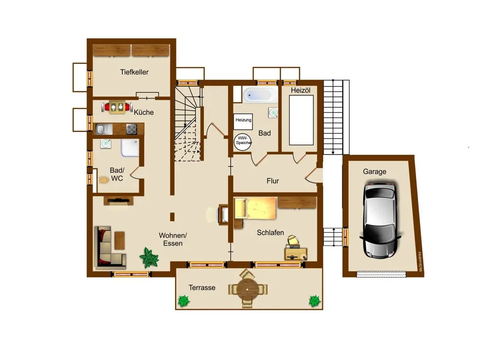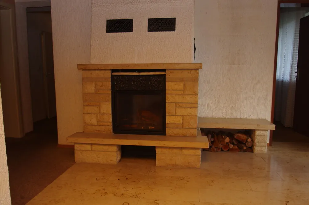 UG-Wohnung mit eigenem Eingang, Küche, Bad mit Dusche, Kamin, 2 Zimmer, Terrasse.
