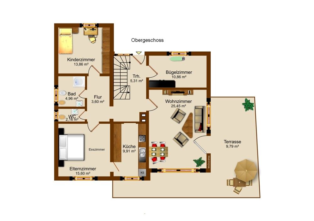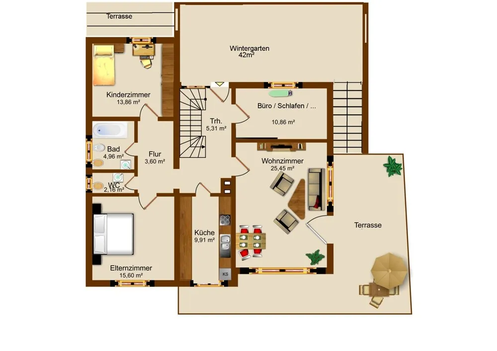 OG: Hauptwohnung mit insgesamt 4 Zimmern, Wintergarten und sehr großer Terrasse.