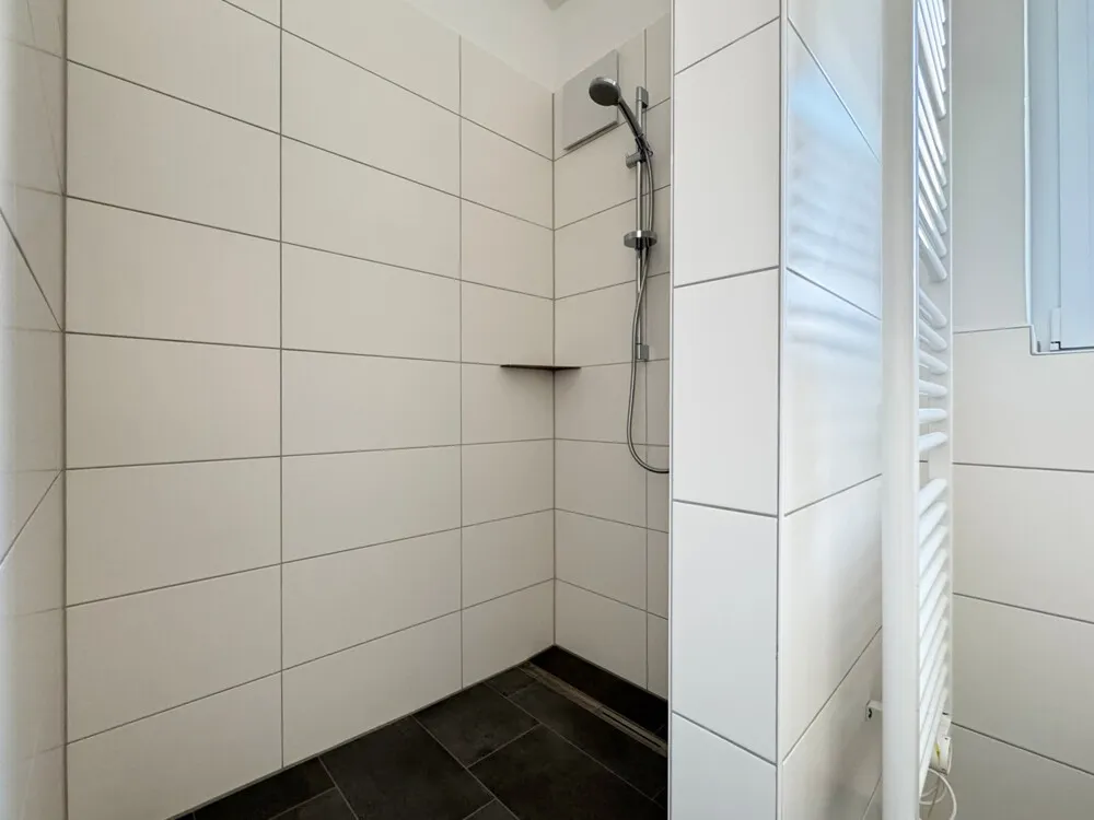- Tageslicht-Badezimmer mit bodentiefer Dusche, Waschbecken, WC, Handtuchheizung (Fliesen)