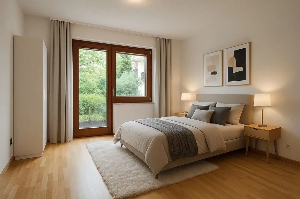 Schlafzimmer mit Zugang zur Terrasse und Garten