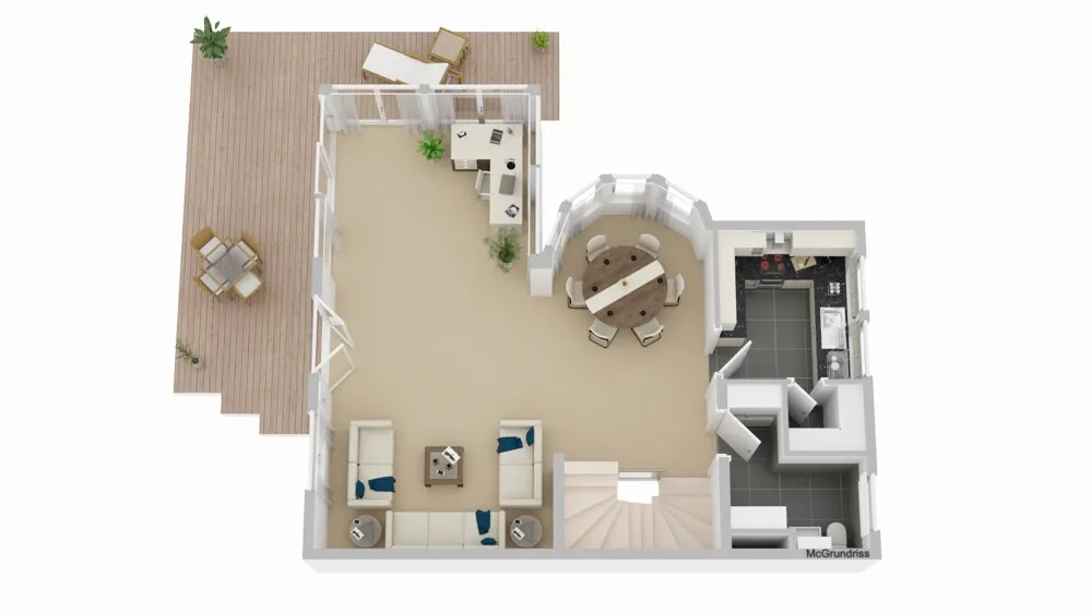-Das Erdgeschoss besticht durch ein riesiges und lichtdurchflutetes Wohn- und Esszimmer mit angrenzendem Wintergarten. Im Sommer kann das Wohnen mit der schönen Terrasse, dem kleinen Swimmingpool, der Grillecke und der charmanten Nische mit Blumenteich gerne nach außen verlagert werden.