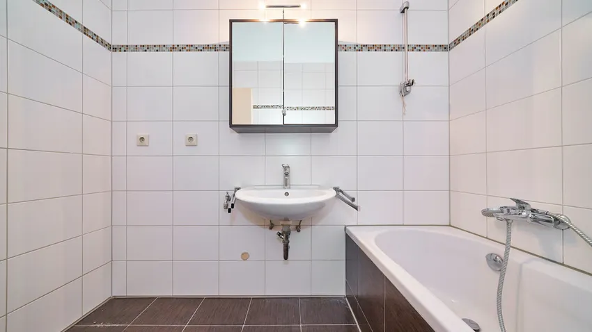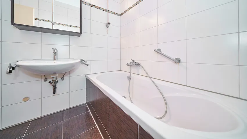 -Bad (Fliesenboden mit Wanne, Waschbecken und WC)