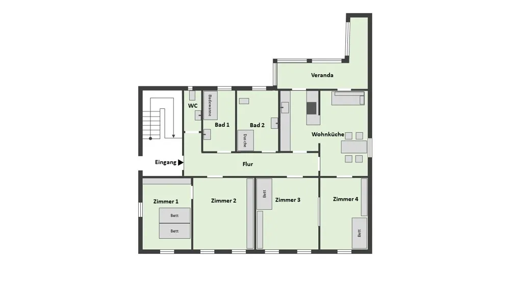 Die charmante und geschmackvolle Wohnung, in der viele Original Einbauten erhalten werden konnten, ist komplett eingerichtet und verfügt über 4 Zimmer,eine Küche mit integriertem Essplatz, zwei Badezimmer, ein Gäste-WC und eine beheizbare Veranda, die an die Küche anschließt.