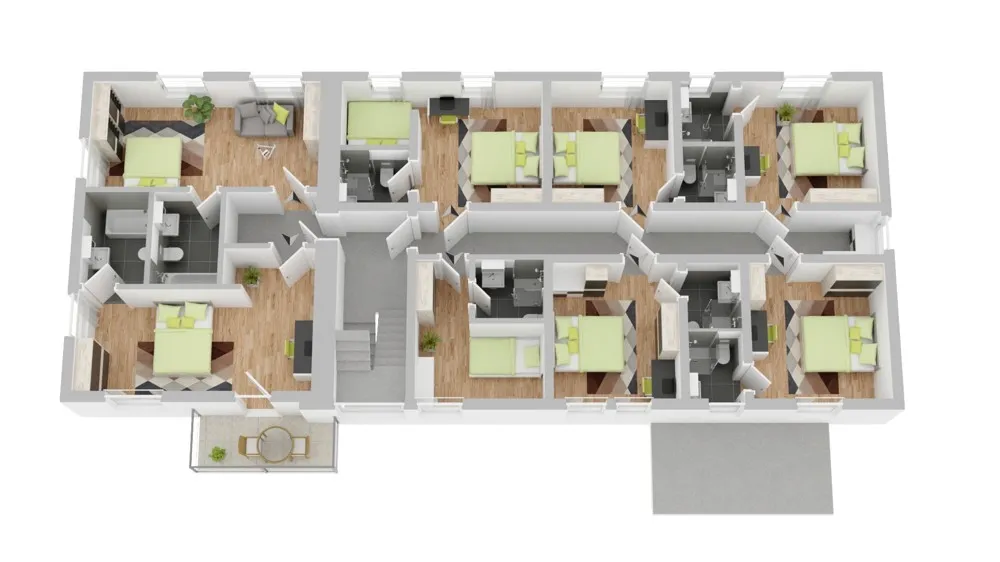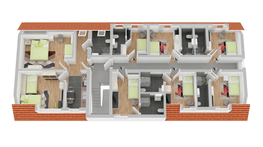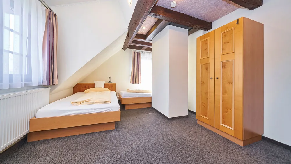 Im Dachgeschoss ergänzen sechs Einzelzimmer sowie ein 2-Zimmer-Apartment mit Küche und Bad das Raumangebot.