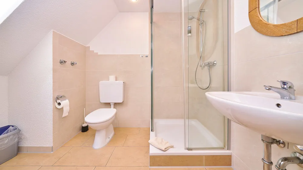 Das Obergeschoss bietet vier weitere Doppelzimmer, drei Dreibettzimmer und ein Einzelzimmer – alle mit eigenem Bad.
