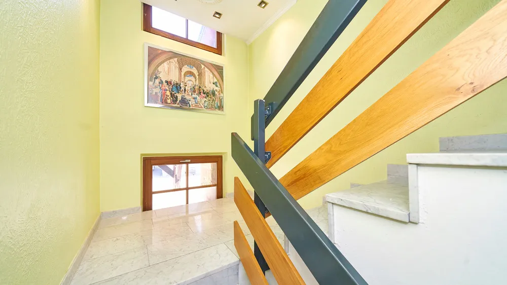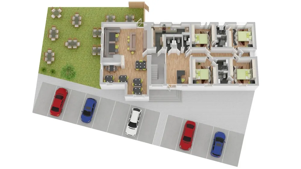 Im Erdgeschoss befinden sich Rezeption, Frühstücksraum mit Theke, eine voll ausgestattete Küche, Sanitärbereiche sowie vier Doppelzimmer mit Bad.