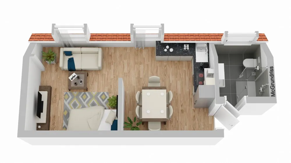 Ergänzt wird das Angebot durch die charmante Dachgeschosswohnung mit 23,37 m². Die gemütliche 1-Zimmer-Einheit verfügt über eine klar strukturierte Aufteilung mit Wohn-, Ess- und Schlafbereich sowie einer Küchenzeile und einem eigenen Badezimmer. Sie eignet sich ideal für Singles, Pendler, Studierende oder als langfristig rentable Kapitalanlage.