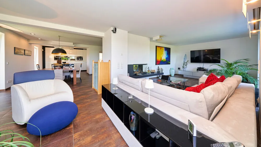 Bodentiefe Fenster im Wohn- und Essbereich eröffnen einen traumhaften Blick ins Neckartal. Der angrenzende Balkon mit Glasboden lädt zu entspannten Stunden ein. Ein offener Kamin mit zweiseitiger Verglasung schafft eine behagliche Atmosphäre.