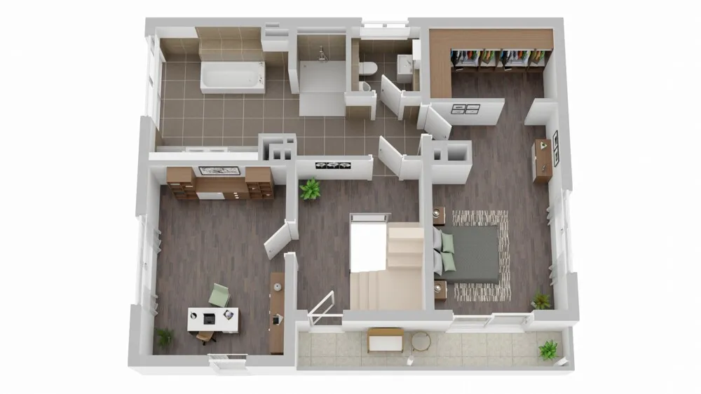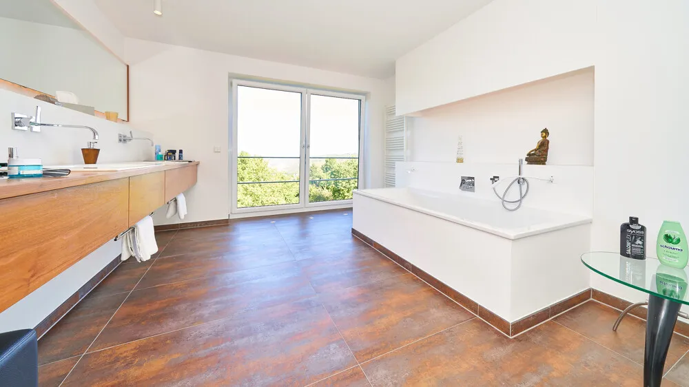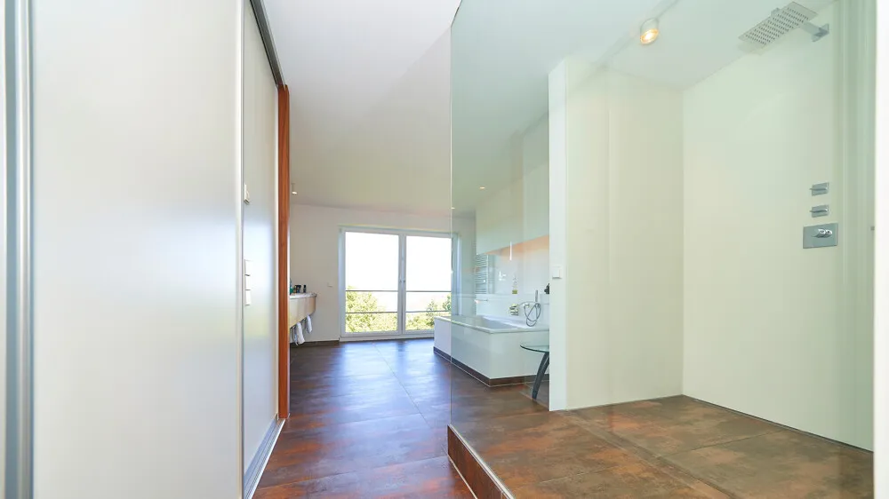 Im Obergeschoss erwarten Sie ein Schlafzimmer mit Ankleideraum sowie ein luxuriöses XXL-Bad mit offener Dusche, Doppelwaschbecken und separatem WC. Ein weiteres großzügiges Zimmer eignet sich flexibel als Büro oder Kinderzimmer. Ein zusätzlicher Balkon mit Westausrichtung rundet das Stockwerk ab.