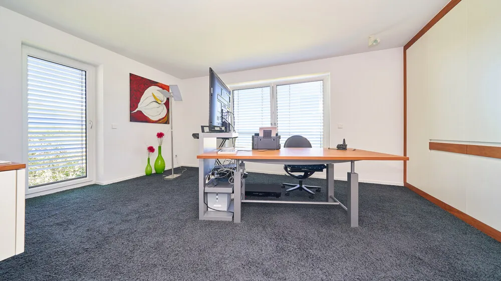 - OG: Arbeitszimmer, Schlafzimmer, Bad, Balkon (Fliesen und Teppich