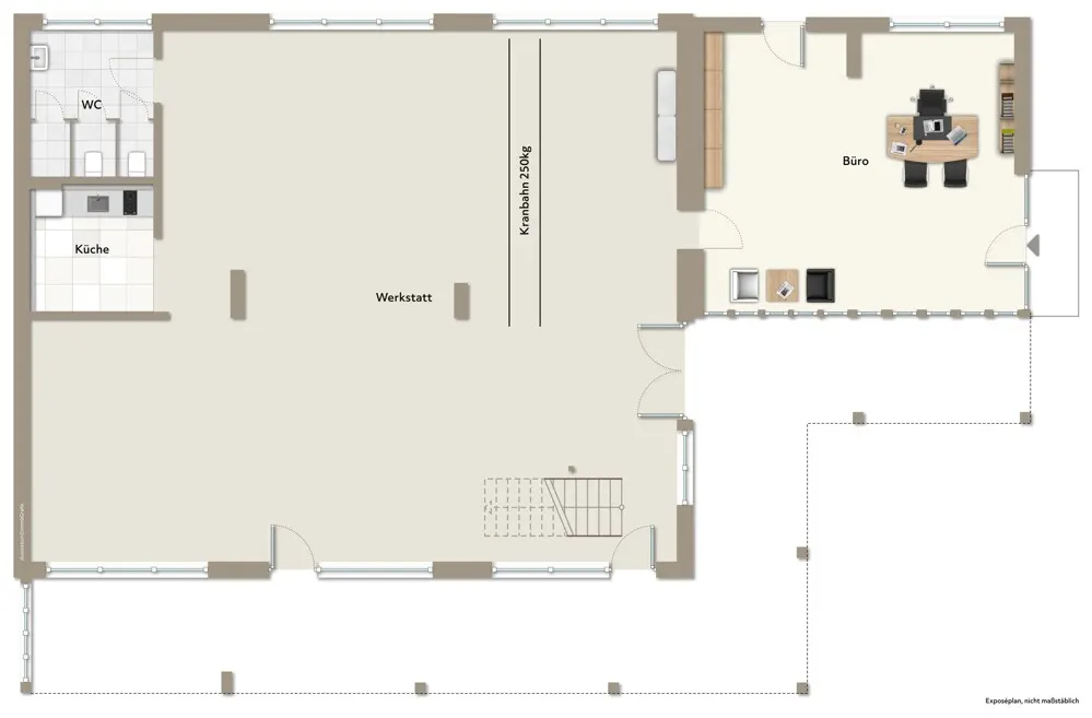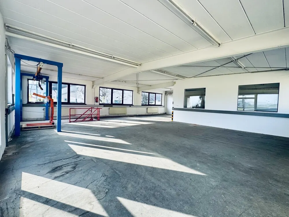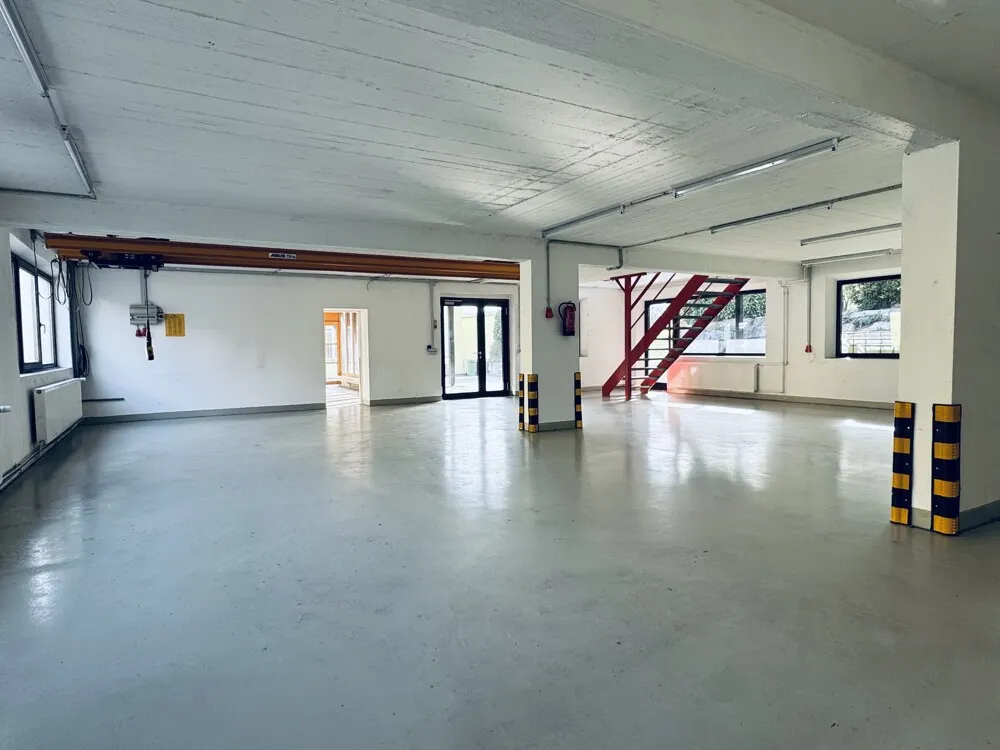 Im Erdgeschoss befinden sich neben dem Hauptwerkstattbereich ein Büro, eine Küche sowie ein Sanitärbereich – alles was für einen professionellen Betriebsalltag benötigt wird. Das Obergeschoss bietet einen weiteren großzügigen Werkstattbereicht mit einer Deckenhöhe von 2,70 m bis 3,10 m. Im Erdgeschoss beträgt die Deckenhöhe 2,30 m bis 2,60 m.
