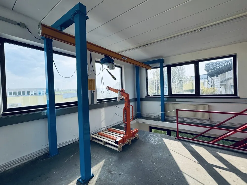 Die technische Ausstattung ist auf hohem Niveau: Eine bodenlose Kranbahn mit 250kg Tragkraft im Erdgeschoss sowie eine Kranbahn mit 500kg im Obergeschoss ermöglichen den sicheren Transport schwerer Lasten auf beiden Ebenen.