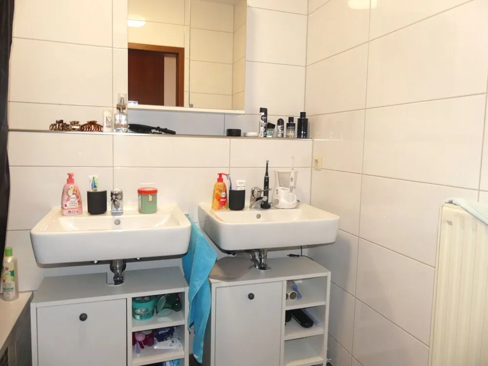 - Badezimmer mit Duschwanne und zwei Waschtischen