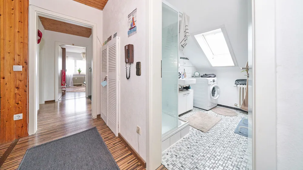 Im Flur entdecken Sie eine clever integrierte Nische, die sich ideal als kreativer und praktischer Stauraum nutzen lässt. Ob ein maßgefertigtes Bücherregal oder ein Garderobenschrank – dieser Platz bietet die Möglichkeit, Ihren persönlichen Stil perfekt in die Gestaltung einzubringen.
