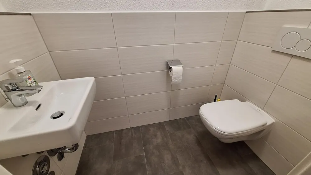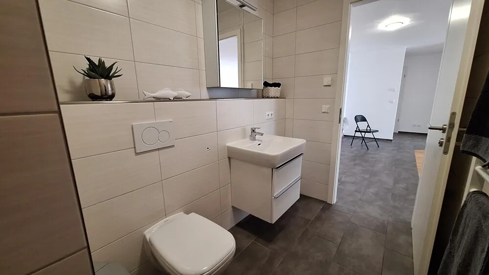 - Badezimmer mit bodengleicher Dusche, Handtuchheizkörper, Waschtisch mit Unterschrank, sowie Spiegelschrank