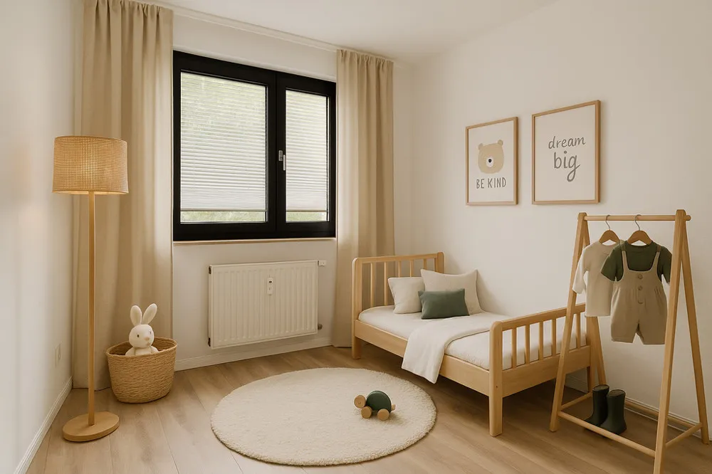 Zwei geräumige Schlafzimmer bieten vielseitige Nutzungsmöglichkeiten, sei es als Kinder-, Gästezimmer oder Büro. Das Badezimmer ist mit einer Badewanne inkl. Duschwand, einem Waschbecken, einem Spiegelschrank und einem Waschmaschinenanschluss ausgestattet. Zusätzlich steht ein Abstellraum und ein separates WC mit Handwaschbecken zur Verfügung.