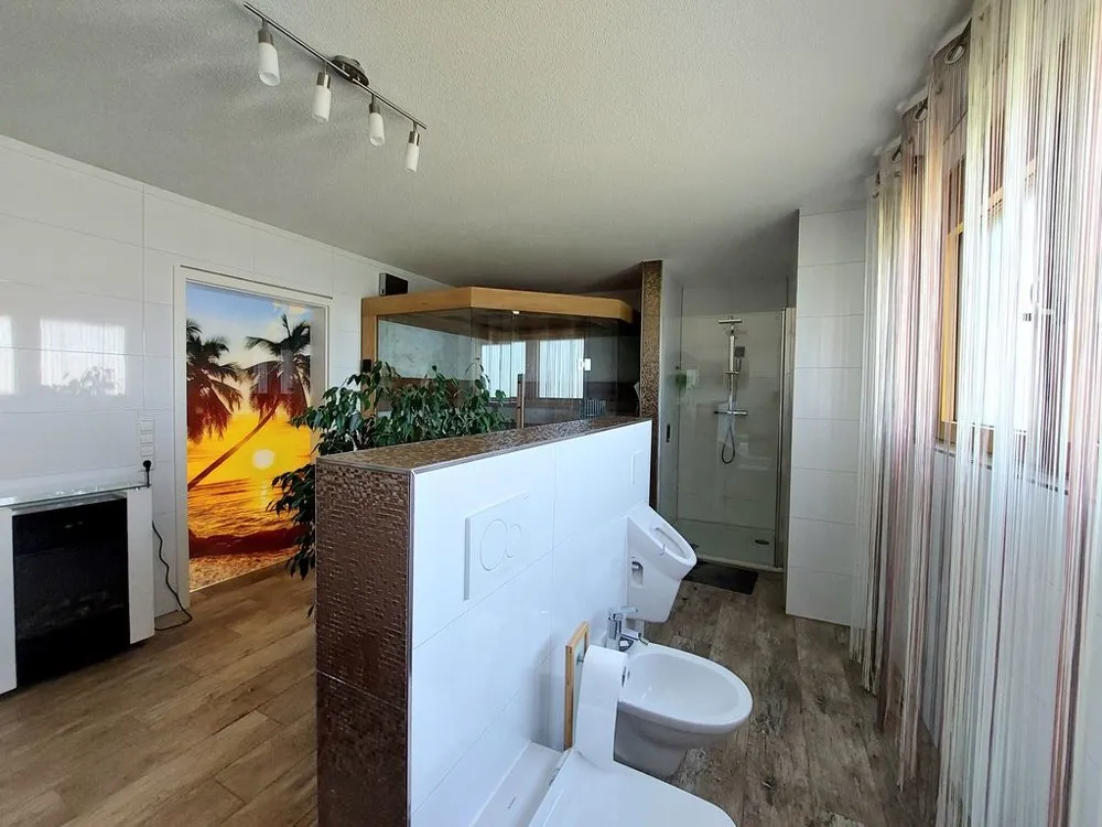 TAGESLICHTBAD ca. 19 m²: Waschtisch, Dusche, WC, Bidet, Urinal, Panorama-Sauna - Ausstattung Zedernholz, Anschluss für Badewanne