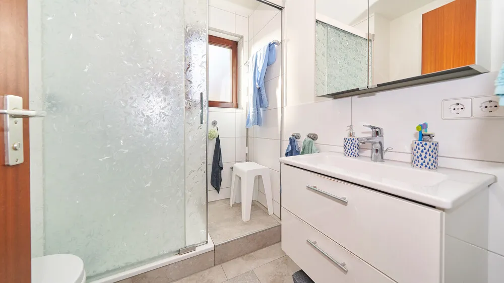 Auch auf dieser Seite befinden sich nach einem weiteren kleinem Flur das moderne Bad mit Waschbecken, Dusche und WC und dem Waschmaschinen-Anschluss.